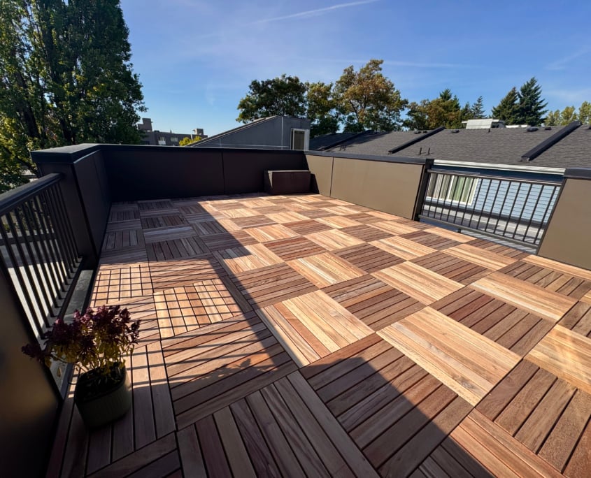 Because they are modular in nature there are distinct advantages to using hardwood deck tiles on a roof deck. If the surface needs cleaning tiles lift out. If there is ever a leak, just uninstall in the area that needs repair and then replace the tiles.